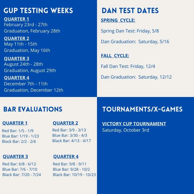 To be eligible for Gup Testing and the next belt, students complete three bars (in order):